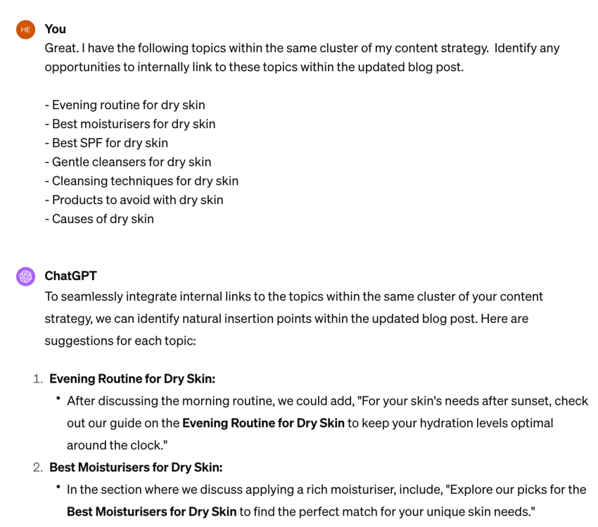 As a final step, you can even feed ChatGPT a list of topics from your cluster and ask it to identify internal linking opportunities from this blog post to the other topics, like this: