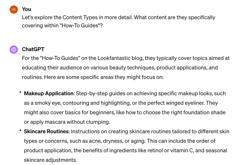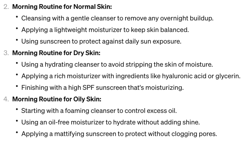 In the example above, the clusters would not be specific enough to cover skin care in-depth. So I asked ChatGPT to create clusters for “Daily Skincare Routines”, which gave me this: