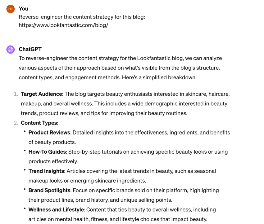This one requires your competitor’s URL and a simple prompt to reverse-engineer the website’s content strategy: