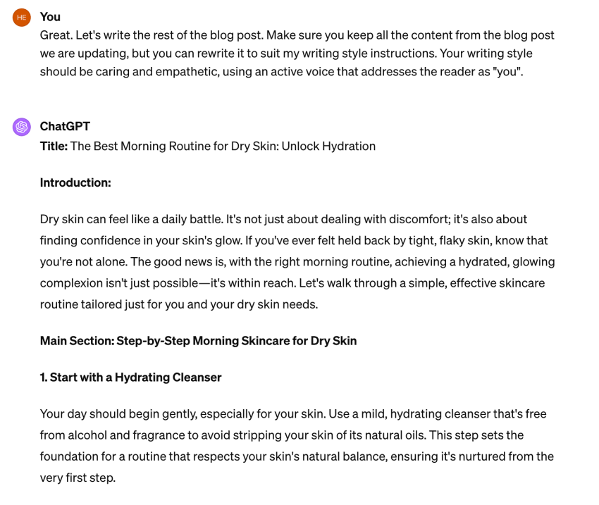 I don’t recommend feeding the article to ChatGPT with a prompt to have it update the content for you. It won’t go in-depth enough, you can’t trust its up-to-date data, and you’re more likely to lose anything valuable from your original content than gain anything out of it.