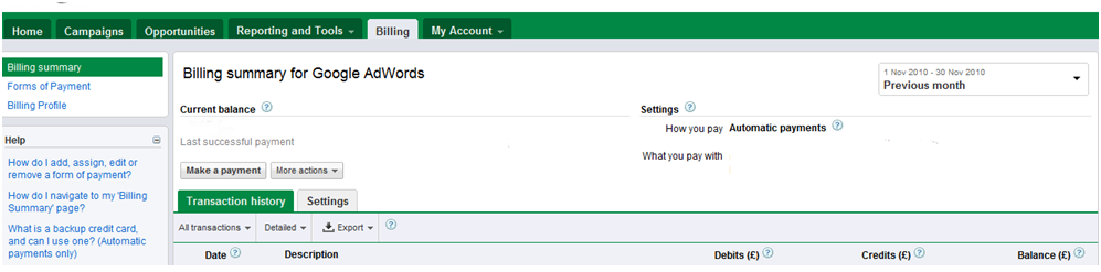 UPDATE: After digging around I’ve found & remembered that this ‘new’ Billing tab is the upgraded tab as mentioned in the AdWords Blog back in June/ July. It’s been so long since that post that I had actually forgotten it. It is interesting to see that I only have this upgrade in only one of my accounts though and so I’m now wondering how long it’s going to take Google to roll the change out across all the accounts- It looks like it could be a while…
