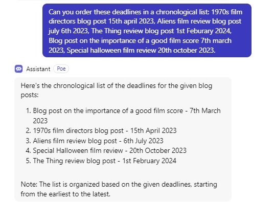 - Order Deadlines in a Chronological List: If you already have an overwhelming number of deadlines, entering them into an AI chatbot and then asking the AI to organize them in chronological order is a helpful way to take a bird’s eye view of your workload and plan accordingly.