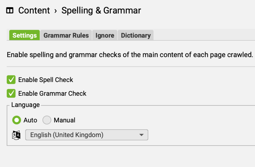 Finally, I look at the Spelling and Grammar Settings under the Crawl Config > Content > Spelling & Grammar. Here, you can enable the spelling and grammar checks and ensure the language is set to match the language used on the site. The website in question uses English and UK spellings, so I will set the language accordingly. If it had a US focus, I would set the language to English (United States of America) to account for the differences in some US spellings. Click OK once done.