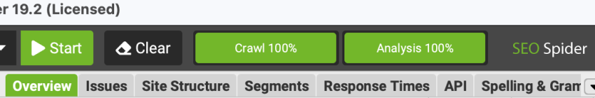 Once the crawl has finished, it is recommended to run a crawl analysis by navigating to Crawl Analysis > Start. This analysis allows additional data to be populated, such as the link score metric for internal URLs, duplicate content, crawl discrepancies such as non-indexable URLs in the XML sitemap and more.