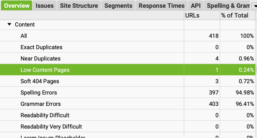 The Content tab provides a thorough overview of your website’s content pages, including their word count, and has a section for Low Content Pages where you can easily see pages that can be expanded with content.