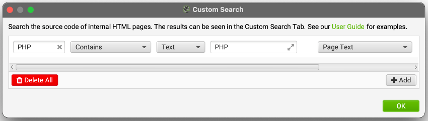 One of the Screaming Frog SEO Spider’s most useful features is Custom Search. With this tool you can find anything you want in the HTML or text of a website. I hand code a lot of PHP, so I configured my spider to look for “PHP” in the text of my website (i.e. the bits that are printed out to the screen, vs those that are the HTML itself). Here’s how that renders in the crawl report: