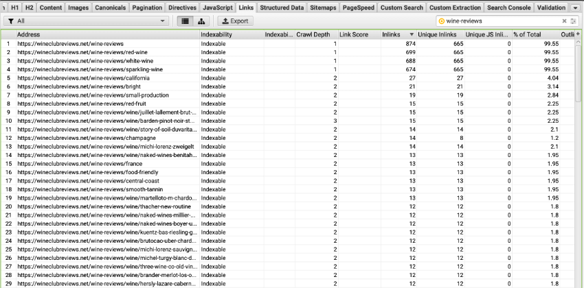 After careful pruning, the 210 wine review pages now have 1k links. If I look at the upper tab called Links and filter by URLs with wine-reviews in them, I can see a good distribution of links with a clear emphasis on the most important pages (for Topical Authority).