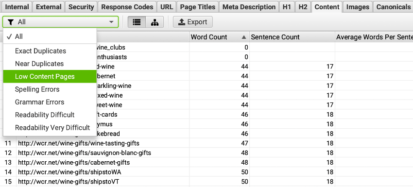 There are two easy methods you can use to identify pages with thin content in Screaming Frog. Both are easily accessed via the Content tab. This report page shows all kinds of easily-tabulated or inferred data about the content area on your pages.