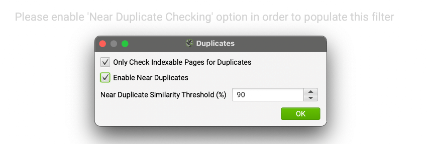 Check “Enable Near Duplicates” and choose a threshold for how similar pages should be before they raise this flag. The default is 90% and that’s adequate for checking for near duplicates.